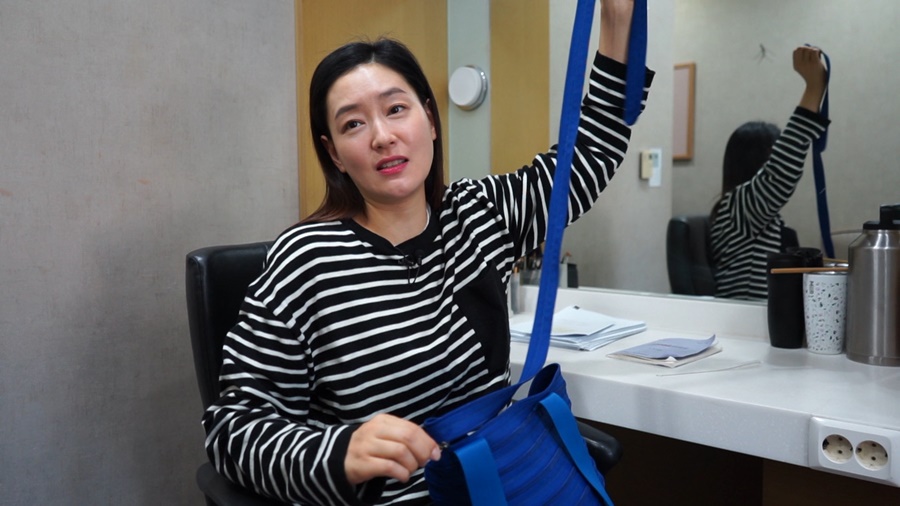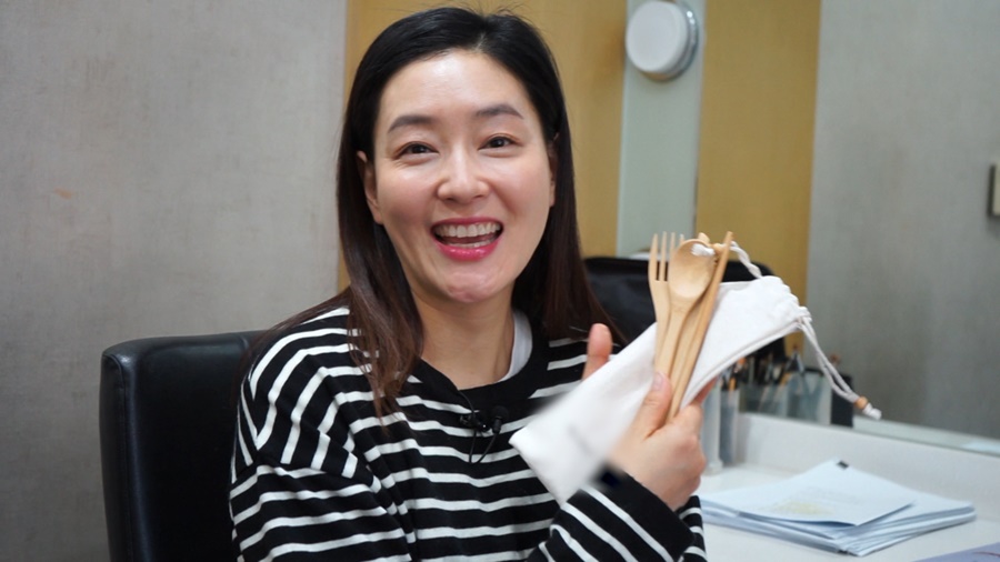 박진희의 최대 고민은 일회용품 사용을 줄이는 것. 숨 가쁘게 돌아가는 촬영장에서도 그날 하루 마실 물을 담은 텀블러는 기본, 수저 세트와 손수건까지 늘 챙겨 다닌다.
