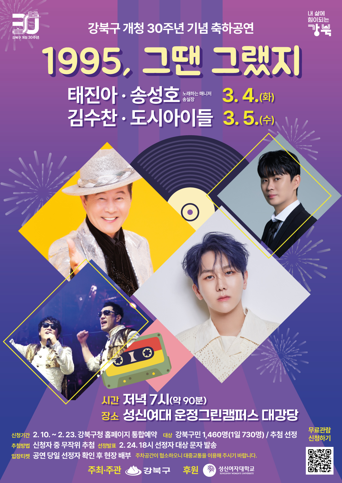 강북구(구청장 이순희)가 개청 30주년을 맞아 오는 3월 4일과 5일 양일간 성신여자대학교 운정그린캠퍼스 대강당에서 기념 축하공연 ‘1995, 그땐 그랬지’를 개최한다.
